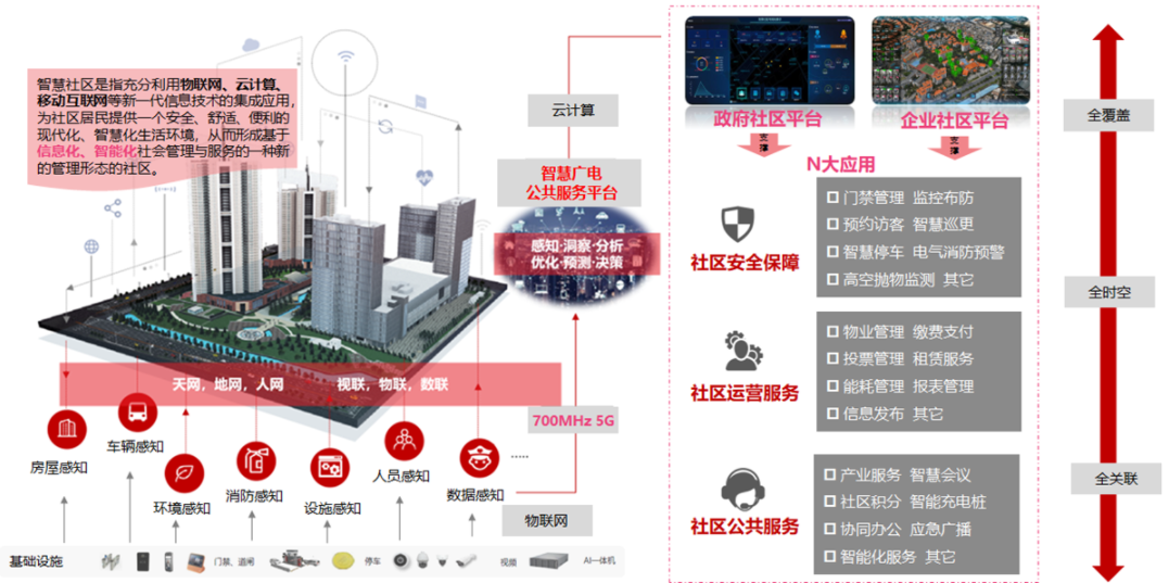 智慧社区是智慧城市的重要组成单元,亦是城市大脑的“最后一公里”。广州广电的智慧社区平台包括电动车电梯监控、高空抛物监控、应急广播等应用,为物业提供便利化、物业管理在线化、基础服务数字化、社区治理智能化的服务。打造智慧社区服务体系,能同时满足公共管理、公共安全、公共服务三大场景的应用需求,在安防、疫情常态化的刚需下,通过5G、AIoT、物联网等技术,大幅提高社区居民的“三感需求”。