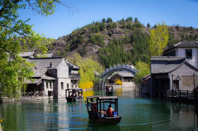 春风拂过汤河两岸,柳丝抽芽,繁花初绽,古北水镇迎来一年中最富诗意的时节。历经冬季休整,摇橹船于清明假期正式复航,乘一叶扁舟穿行水巷,看黛瓦灰墙倒映水中,听橹声欸乃,尽览水镇的温婉与灵动。